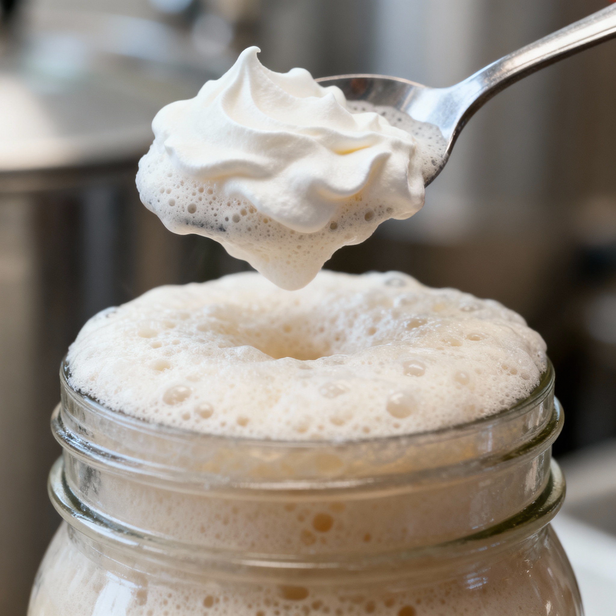 I use a sanitized spoon to scoop about half a cup of this creamy foam into a mason jar. This method yields cleaner yeast than bottom-harvesting because it avoids the hop resins and grain dust that settle at the bottom.